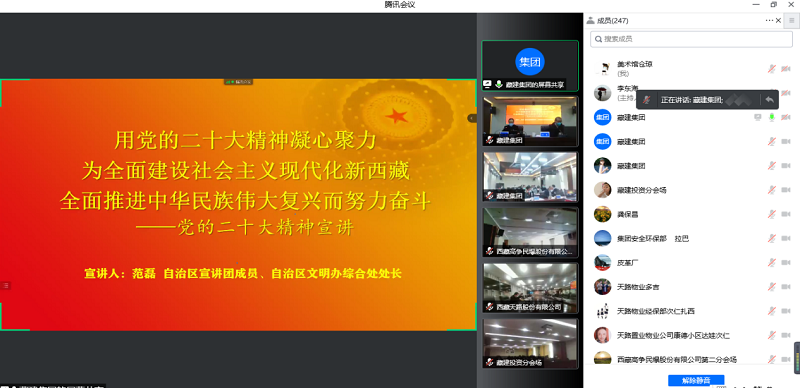 為深入學(xué)習(xí)宣傳貫徹黨的二十大精神,西藏建工建材集團有限公司(以下簡稱“集團”)按照集團黨委學(xué)習(xí)黨的二十大精神計劃及宣講方案安排,于2022年12月7日下午15:30在藏建集團5樓會議室,邀請區(qū)黨委宣傳部文明辦綜合處處長范磊同志,圍繞黨的二十大精神開展宣講會。西藏天路股份有限公司(以下簡稱“公司)黨委書記、董事長、總經(jīng)理、監(jiān)事會主席、黨委專職副書記、紀(jì)委書記,各中層管理人員等共55人參加視頻會議。